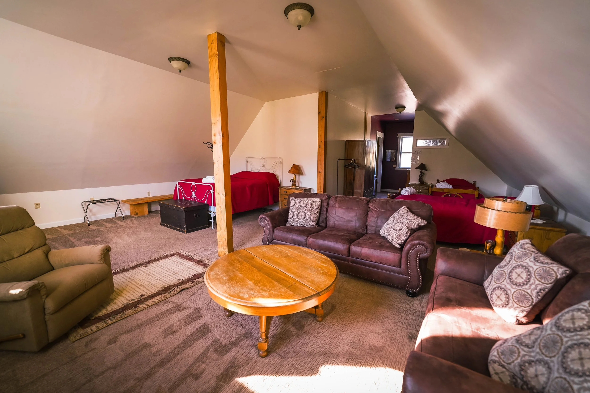 Upstairs you will be welcomed to 1 bedroom with a queen size bed and our open loft with 1 more queen bed and 2 twin beds along with a nice seating area with couch's and recliners.