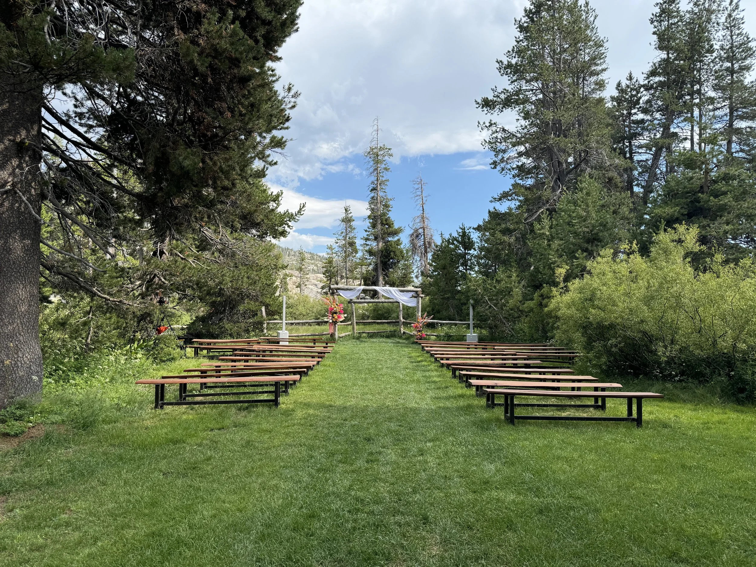 For your big day we have multiple sites for you to choose from - we have our traditional wedding site nestled in the trees with green grass, log arbor and surrounded by natural vegetation. We also have other sites if you prefer such as areas by the Main Lodge and Saloon, next to the lake, or behind the saloon surrounded by granite. If you are looking for something unique and never done before you are welcome to wander the property and find your own wedding site that fits the two of you perfectly.